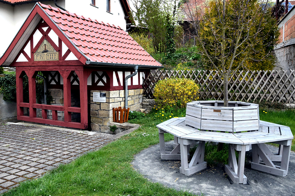 Durchaus interessant ist in diesem Zusammenhang der dem Brunnen umgebende Platz. Hier habe eine Dorflinde gestanden, die leider im Zuge des Wasserleitungs- und Kanalbaues sowie des anschließenden Straßenbaues weichen musste. Auch gehe aus Aufzeichnungen des Lehrers Adam zur Ortsgeschichte hervor, dass bis 1820 dort ein aus Holzplatten gefertigtes sogenanntes „Drillerhäuschen" gestanden habe. In dieses Häuschen seien Personen eingesperrt worden, die eine „geringfügige Straftat" begangen hatten (in der Gemeinde oder möglicherweise bei einem Ehestreit). Sie mussten dort ihre Strafe absitzen und wurden somit öffentlich an den Pranger gestellt: Für die betreffende Person war das natürlich äußerst unangenehm. Das Drillerhäuschen würde wohl heute nicht mehr der Rechtsprechung entsprechen, aber eine neue Linde mit einer Bank wertet den Platz weiter auf. Die Linde sei 2018 von mehreren Anleiegern gemeinsam gepflanzt worden, wusste Anita Förtsch, während die Bank vor zwei Jahren durch die Römhilder Firma „Dach- und Holzbau" aufgestellt wurde und von weiteren sieben Hainaer Unternehmen und Genossenschaften fianziert wurde.