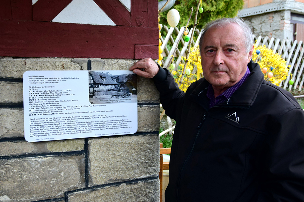 Horst Thein hatte sich dieser Brunnengeschichte nochmals angenommen, die nach seinen Angaben einst der ehemalige Lehrer Ernst Weschenfelder festgehalten hatte. Er habe u.a. in Kirchenunterlagen und Kreisarchiven weiter recherchiert, um einige Daten und Fakten zu komplettieren. Denn am Brunnenhaus sind eine Reihe von Inschriften und Zahlen zu sehen, die dem Betrachter wohl sprichwörtlich als „böhmische Dörfer" vorkommen müssen. Darunter auch Inschriften und Zahlen, die auf das Jahr 1922, als auf eine Zeit vor genau 100 Jahren hinweisen. Diese Inschriften nachvollziehbar und verständlich zu machen, war eine Aufgabe, die sich Horst Thein angenommen hatte. Er entwarf dazu eine Tafel, auf der Zahlen und Inschriften im wahrsten Sinne des Wortes „buchstäblich" enträtselt wurden. Die am Brunnenhaus vor Ostern angebrachte Tafel gibt nun Aufschluss über seine Erbauer, über die damals tätigen Schultheißen (Bürgermeister) und über das Bauwerk selbst. Gesponsert wurde die Tafel von der Jagd- und der Waldgenossenschaft Haina.