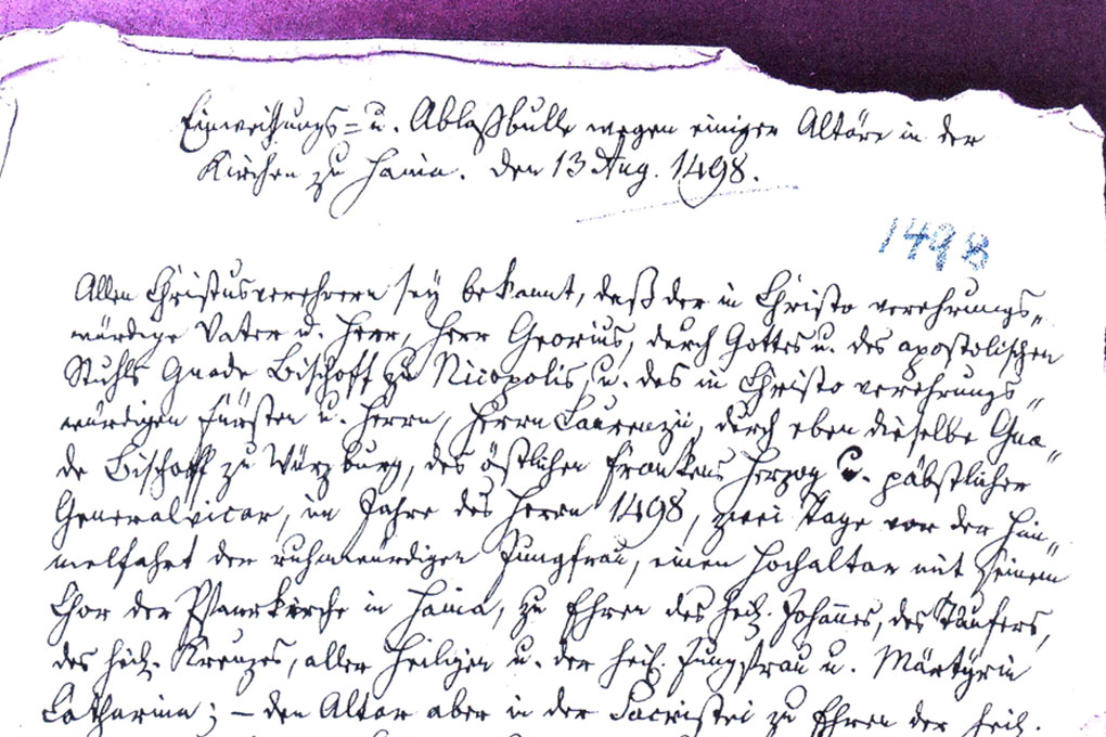"Allen Christusverehrern sey bekannt, daß der in Christo verehrungswürdige Vater u. Herr, Herr Georius, durch Gottes u. des apostolischen Stuhls Gnade Bischoff zu Nicopolis, u. des in Christo verehrungswürdigen Fürsten u. Herrn, Herrn Laurenzii, durch eben dieselbe Gnade Bischoff zu Würzburg, des östlichen Frankens Herzog u. päpstlicher Generalvicar, im Jahre des Herrn 1498, zwei Tage vor der Himmelfahrt der ruhmwürdigen Jungfrau, einen Hochaltar mit seinem Chor der Pfarrkirche in Haina, zu Ehren des heil. Johannes, des Täufers, des heil. Kreuzes, aller Heilgen u. der heil. Jungfrau u. Märtyrin Catharina; - den Altar aber in der Sacristei zu Ehren der heil. Margaretha, der heil. Barbara u. der heil Afia, der Mutter der Jung- frau Mariä; - darnach am 3ten Tag zum nächtlichen Gottesdienst (Mette) der Himmelfahrt eben derselben glorwürdigen Jungfrau hat ebenderselbe verehrungswürdige Vater einen Altar in der Mitte dieser Kirche zu Ehren aller Apostel, des heil. Märtyrers Laurenzius, des heil.